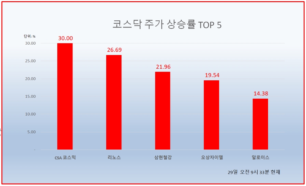 29일 오전 9시 33분 현재 코스닥 상승률 상위 50개 종목은 다음과 같다.