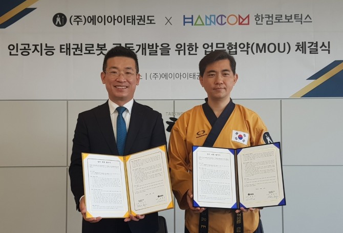 이미지 확대보기양사는 경기도 김포시 ’에이아이태권도’ 본사에서 전동욱 한컴로보틱스 대표와 최중구 에이아이태권도 대표 등 관계자들이 참석한 가운데 인공지능(AI)기반 태권 로봇 개발을 위한 상호협력을 약속했다.