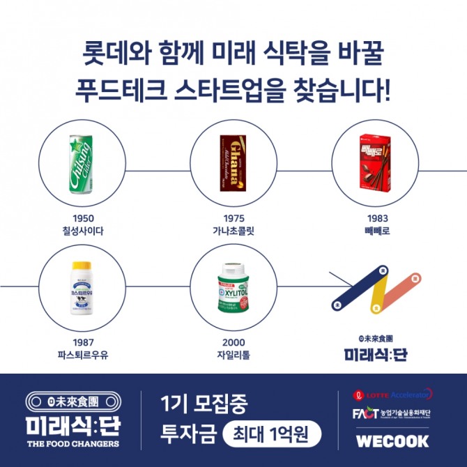 롯데지주에 따르면 롯데액셀러레이터는 식음료 관련 혁신적 아이디어와 기술을 보유한 푸드테크 스타트업을 키우기 위해 ‘미래식단(未來食團)’ 1기를 오는 5월 14일까지 모집한다.