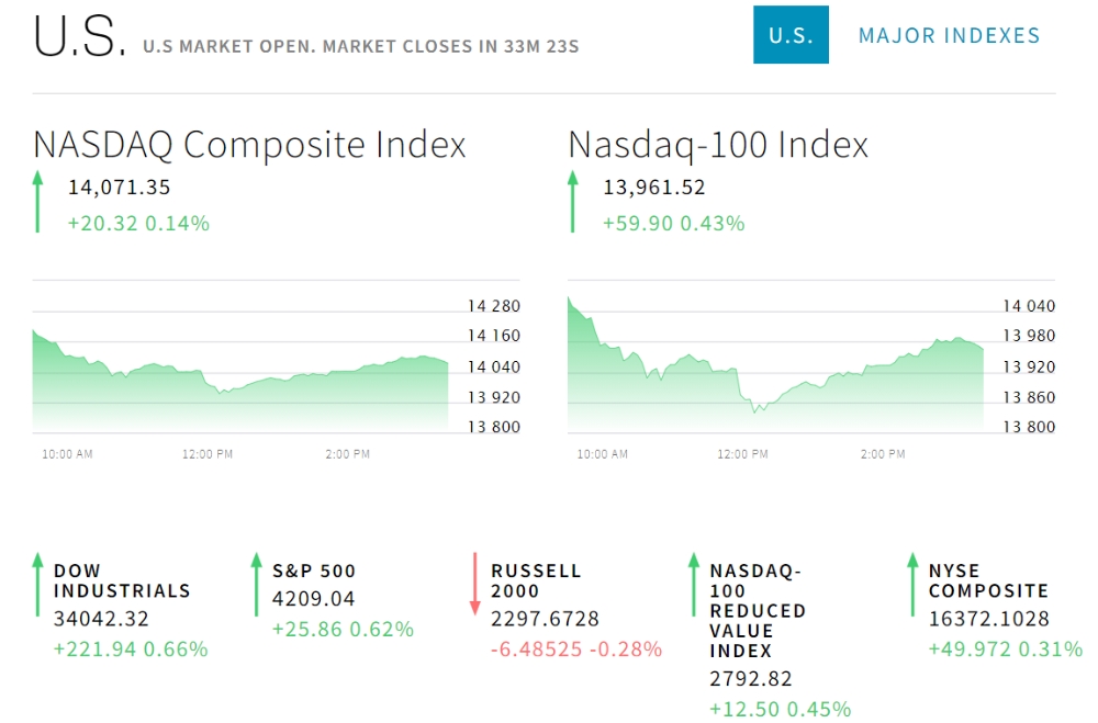 이미지 확대보기30일 뉴욕증시에 따르면 이 시각 현재 뉴욕증권거래소(NYSE)에서 다우존스30산업평균지수와 스탠더드앤드푸어스(S&P)500지수 그리고 나스닥지수는 모두 상승하고 있다.