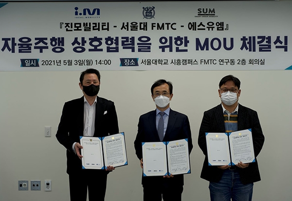 진모빌리티의 대표 프리미엄 대형 승합택시 'i.M(이하 아이엠)'이 서울대학교 미래모빌리티기술센터(FMTC), SUM(Smart Urban Mobility)와 함께 미래 모빌리티 연구개발을 위한 업무협약을 체결했다고 4일 밝혔다.지난 3일, 서울대학교 미래모빌리티기술센터에서 진행된 협약식에는 진모빌리티 조창진 대표, 이성욱 대표와 FMTC 이경수 센터장, SUM 현영진 대표를 비롯한 관계자들이 참석한 가운데 자율주행 시현 및 연구동 소개와 함께 향후 사업 계획에 대해 논의하는 시간을 가졌다.
