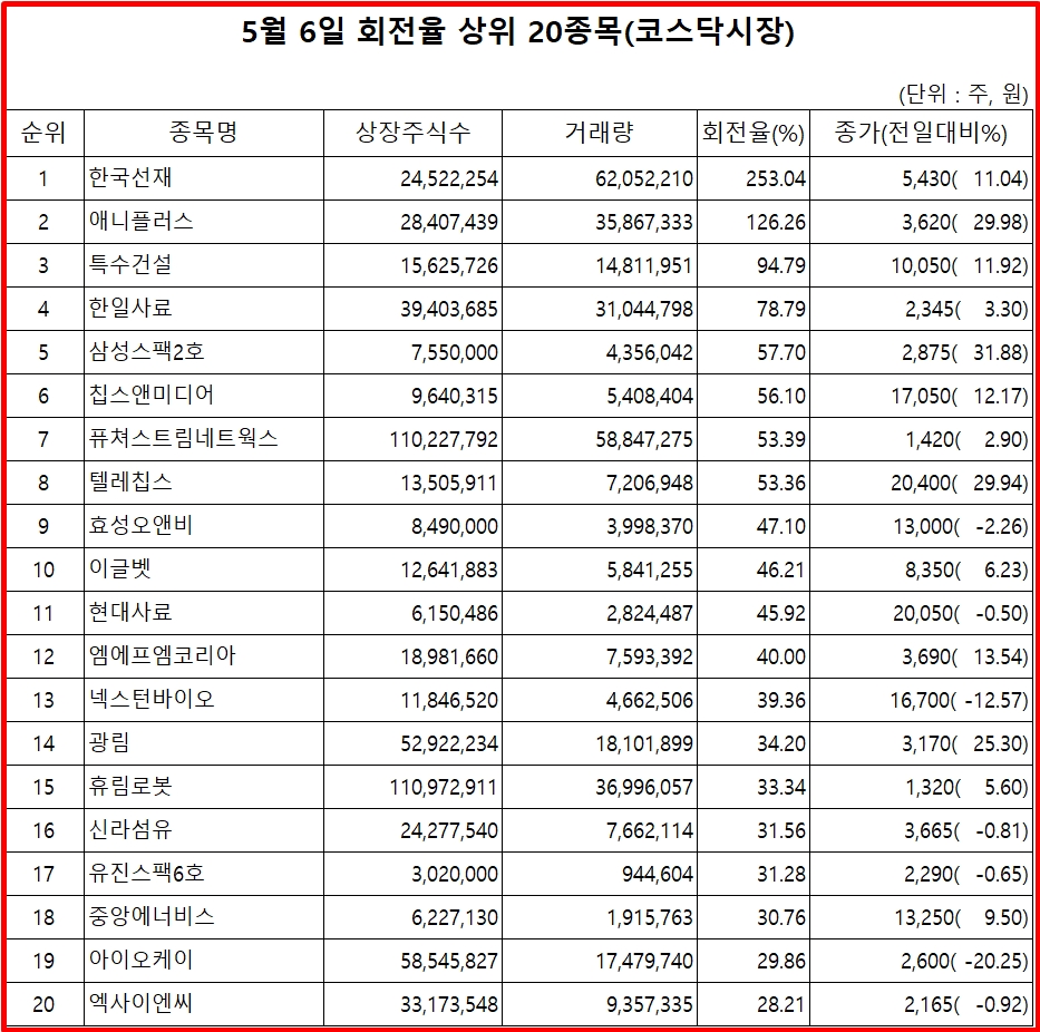 6일 주식시장에서 코스닥 종목의 거래량 회전율 기준 상위 종목은 다음과 같다.