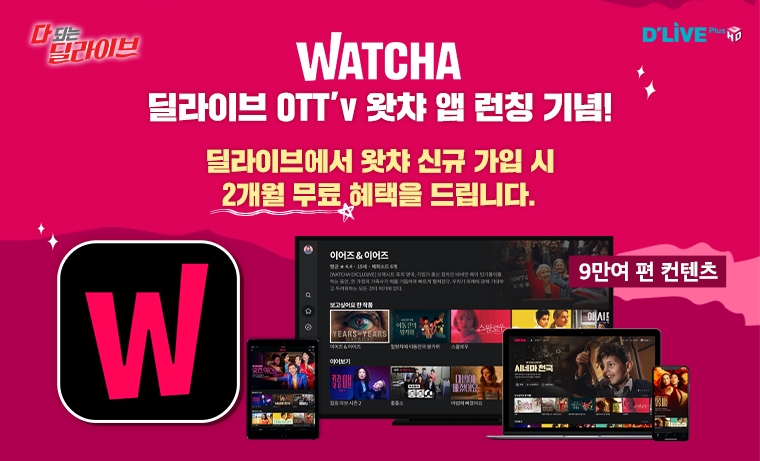 왓챠와 딜라이브 디지털OTT방송은 왓챠의 '딜라이브 OTTv' 앱 출시를 기념해 신규 회원들에게 2개월 무료 이용 혜택을 주는 공동 이벤트도 진행한다.