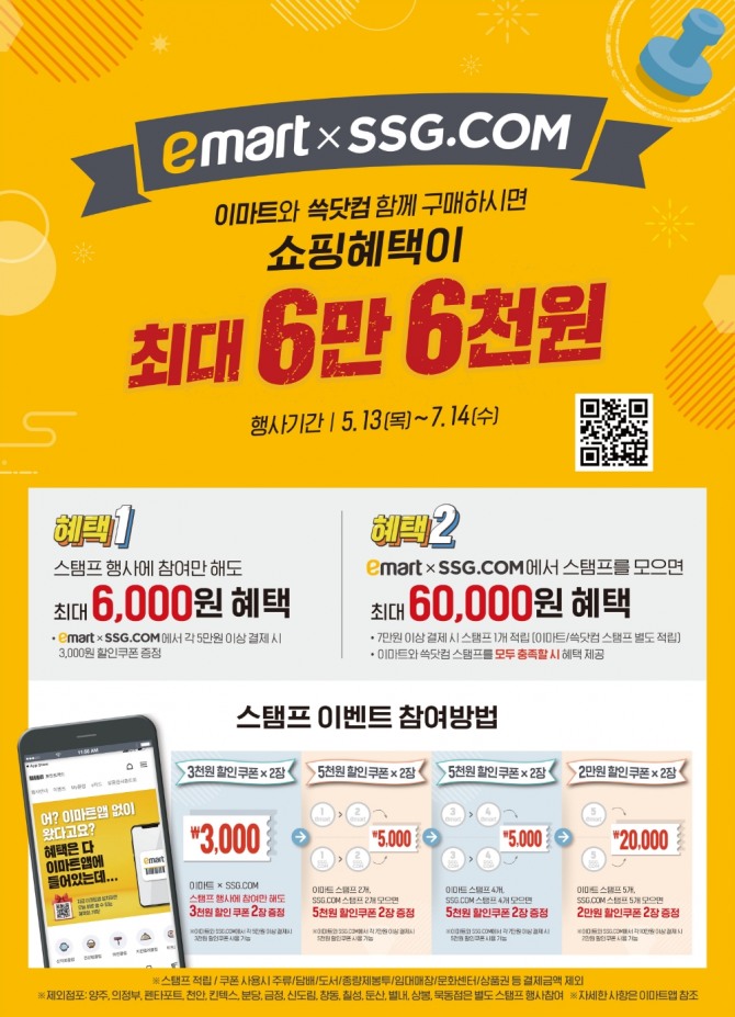 오는 7월 14일까지 열리는 ‘스탬프 프로모션’은 일정 조건을 달성할 때마다 이마트나 SSG닷컴에서 쓸 수 있는 할인쿠폰을 발급받는 방식으로 전개된다.