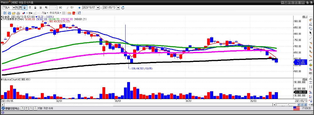 이미지 확대보기지수가 3거래일 연속 하락한 데 따른 반발 매수세가 들어오며 기술주를 중심으로 주가가 반등했지만, 비트코인 구설에 휘말린 테슬라는 3% 넘게 하락했다. 테슬라는 2020년 3월 이후 최악의 주를 보내고 있다.