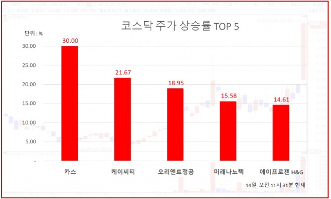14일 오전 11시 31분 현재 코스닥 상승률 상위 50개 종목은 다음과 같다.