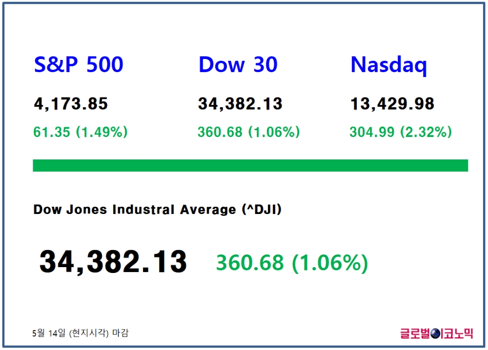 스탠다드앤드푸어스(S&P) 500 지수는 전 거래일 보다 61.35포인트 (1.49%) 상승하며 4173.85에 거래를 마감했고, 기술주 중심의 나스닥 지수도 304.99포인트 (2.32%) 상승한 1만3429.98에 마감했다.