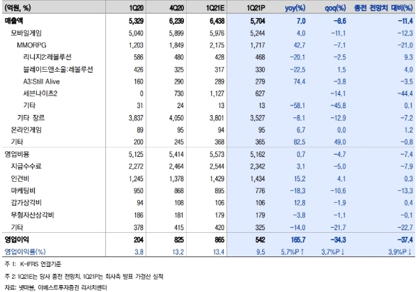 김현용 현대차증권 연구원은 "매출은 일곱개의 대죄가 글로벌 1주년 업데이트로 855억 원으로 기대치 부합했으나, 세븐나이츠2가 630억 원으로 일평균매출 7억 원에 그치며 전망치를 두자리수에 밑돌았다”며 “영업마진도 9.5%로 전망치를 3.3%포인트를 밑돌았는데, 매출하회와 연봉인상분 반영에 따른 인건비증가가 주요 원인”이라고 분석했다.