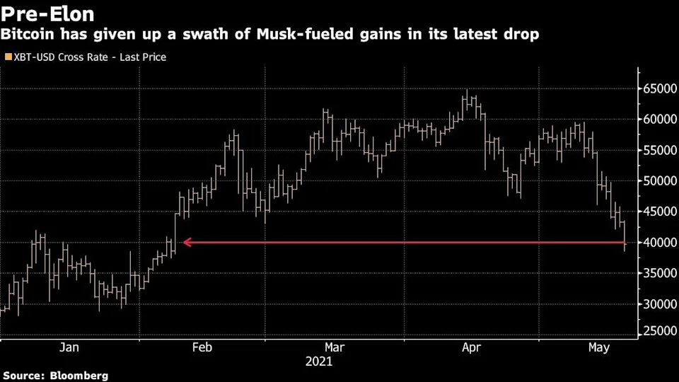 지난주 더이상 비트코인을 결제대금으로 받아들이지 않겠다는 발표로 암호화폐 옹호자들을 놀라게 한 테슬라 최고경영자(CEO) 머스크가 변동성을 부채질하고 있다. 여기에다 지난 주말 머스크가 암호화폐의 환경 부하에 대한 비판을 제기하면서 비트코인이 약 15% 폭락하는 등 더욱 어두워졌다.