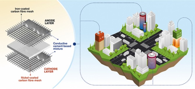 시멘트를 다른 재료와 혼합해 형성하는 콘크리트는 세계에서 가장 일반적으로 사용하는 건축 자재다. 탄소 배출이 많은 시멘트를 사용한다는 점에서 지속 가능성 관점에서 볼 때 이상적이지는 않지만 전원 기능을 추가할 가능성은 새로운 차원을 제공한다는 점에서 기발하다.