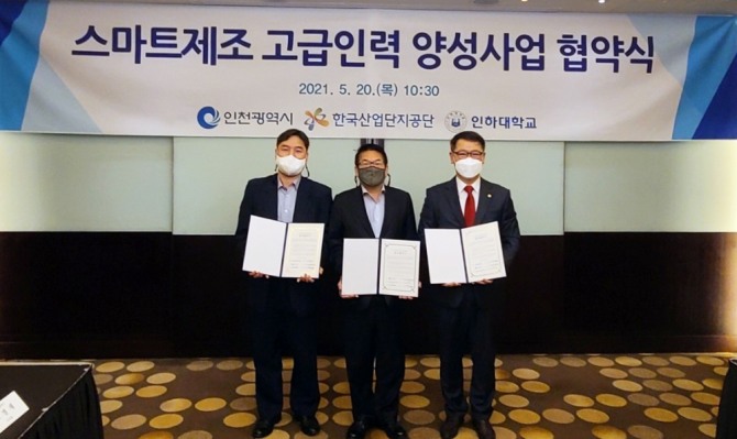 이미지 확대보기인하대는 20일 오전 인천광역시, 한국산업단지공단과 ‘인천 남동 스마트제조 고급인력 양성사업’의 원활한 추진을 위한 업무협약을 체결하였다.