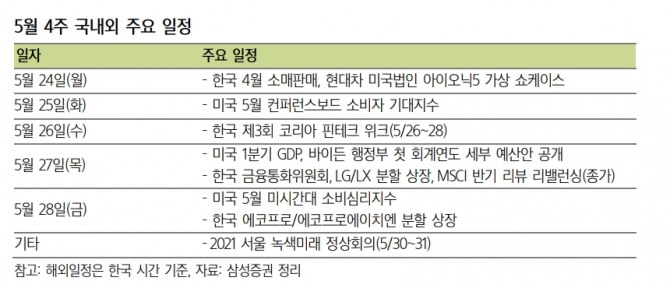 삼성증권은 투자 아이디어로 ▲ 대형주(IT/자동차/바이오): 삼성전자, 기아, 삼성바이오로직스, 삼성물산 투자 아이디어 ▲친환경: 삼성SDI, SK이노베이션, LG전자, 한화솔루션(신규) ▲경기민감주: 한국조선해양, 현대제철을 제안했다.