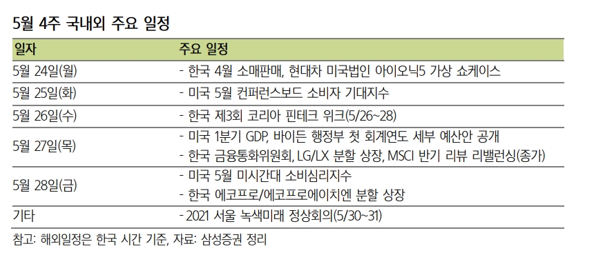 이번 주는 미국 바이든 행정부의 세부 예산안이 공개되는데, 지난 대선에서 공약했던 친환경, 인프라 투자에 대한 시기와 정책 모멘텀이 구체화될 시점이다.
