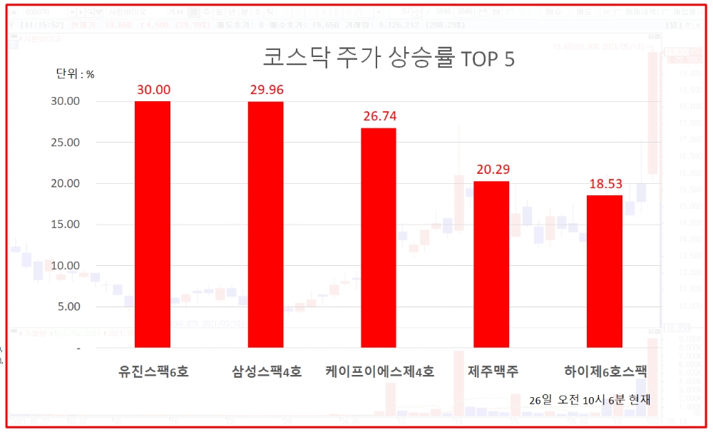 이외에도 케이프이에스제4호, 하이제6호스팩, 유안타제6호스팩, 삼성스팩2호도 주가상승률 상위권에 포진했다.