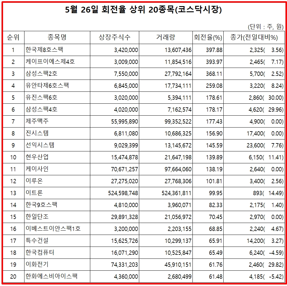 거래량 회전율 상위 종목, 한국제8호스팩·케이프이에스제4호·삼성스팩2호 순
