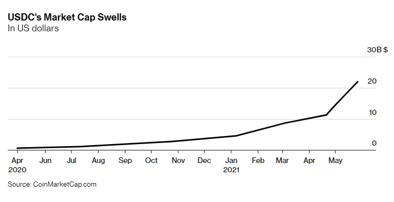 실제로 글로벌 가상화폐 시황 중계사이트 코인마켓캡에 따르면 지난해까지 미미한 규모였던 USDC 시가총액은 올들어 상승곡선을 그리고 있고 특히 이달들어 폭증세를 기록하고 있다.