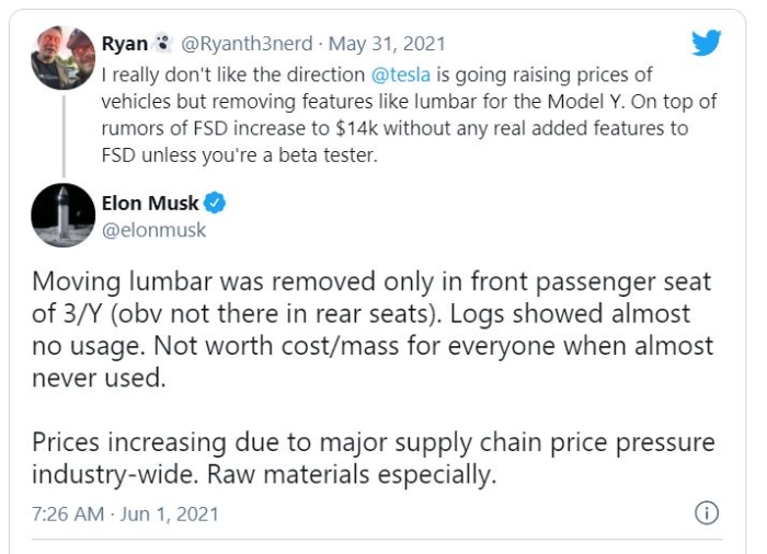 머스크는 테슬라 모델Y에서 조수석 요추받침대를 제거한 것에 대해 "거의 사용되지 않는 것으로 나타났다. 이런 경우 모든 사람이 비용을 지불할 가치가 없다"고 답했다.