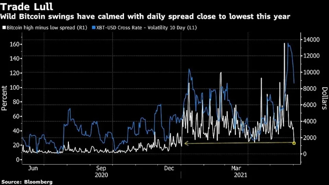세계에서 가장 큰 암호화폐 비트코인은 화요일 3.3% 오르며 3일 연속 상승했다. 미국 금융당국이 규제에 적극적인 역할을 할 준비를 하고 있다는 보고에도 일일 최고치와 최저치 사이의 스프레드로 측정한 가격 변동 폭은 연초 이후 최저로 떨어졌다. 이에 따라 비트코인의 10일 변동성은 5월 24일 162% 최고치에서 106%로 다시 떨어졌다.