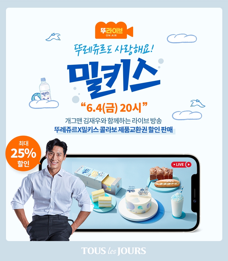 뚜라이브 시청 고객을 위해 풍성한 할인 혜택도 마련했다. 방송 중 11번가 전용 뚜레쥬르 밀키스 제품 교환권을 25% 할인된 금액에 판매한다. 라이브 중 방송 하단에 노출되는 상품을 클릭하면 구매할 수 있다.