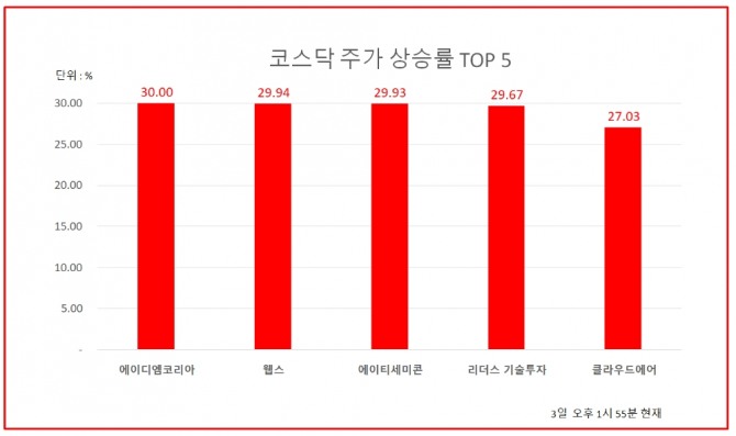 이상 상한가 종목은 에이엠디코리아 외에도 웹스, 에이티세미콘, 리더스기술투자 등도 동반 상한가를 기록하고 있다.
