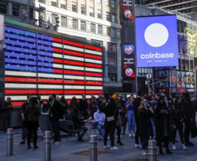 미국 최대 암호화폐 거래소 코인베이스글로벌(Coinbase Global Inc) 직원들이 올해 4월 14일 미국 뉴욕 타임스퀘어의 나스닥 마켓 사이트 점보트론에 상장을 알리는 로고가 전시된 것을 지켜보고 있다.      사진=로이터이미지 확대보기