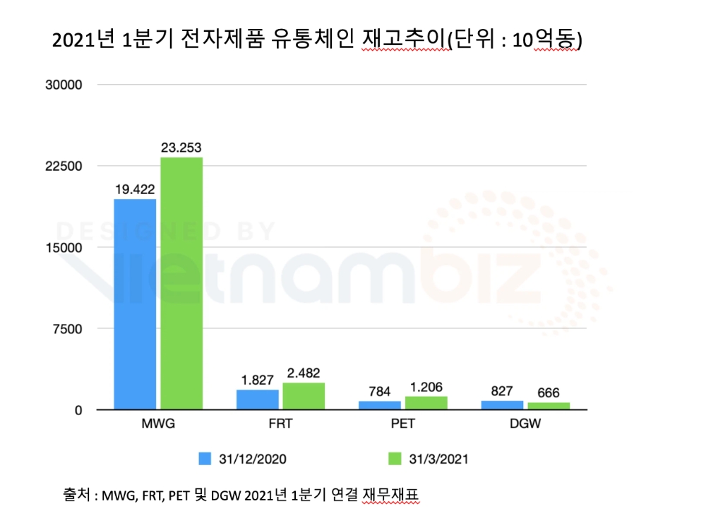 이중 재고자산 가치는 연초보다 6550억동 증가한 2조4280억동이었다. FPT 리테일측은 1분기에 삼성전자와 샤오미의 베트남 독점 유통판매업체인 디지월드에서 제품 구매량을 확대하는 한편, 애플 베트남에서의 구매량을 축소했다고 설명했다.