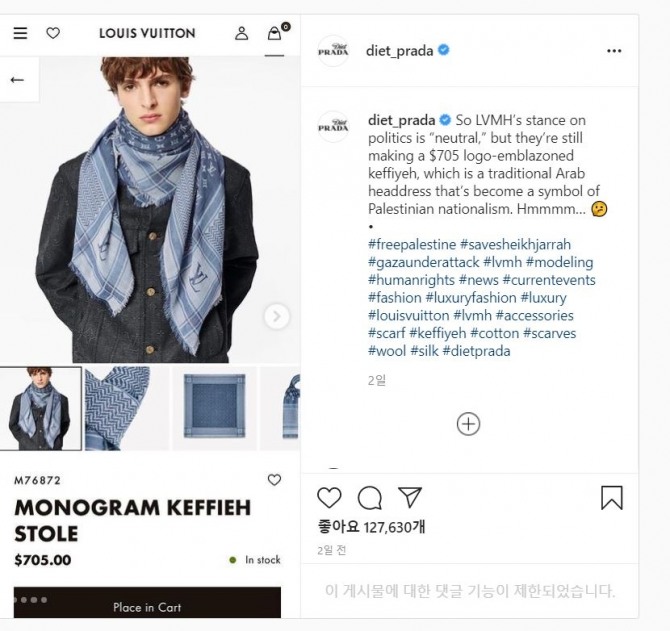 다이어트 프라다(Diet Prada)는 "LVMH의 정치에 대한 입장은 '중립적'이지만, 그들은 여전히 705달러짜리 로고가 새겨진 케피예를 만들고 있다. 이것은 팔레스타인 민족주의의 상징이 된 아랍 전통 두건이다"라고 개제했다.