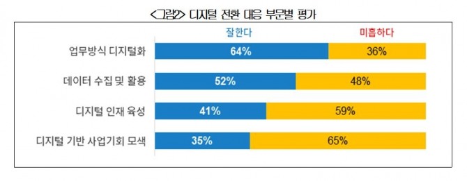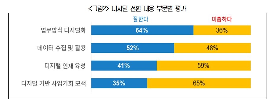 반면, ‘디지털 인재 육성’과 ‘디지털 기술을 활용해 사업기회 모색’에 대한 노력은 미흡한 것으로 지적됐다.
