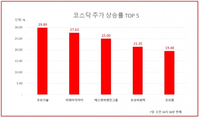 7일 오전 10시 38분 현재 코스닥 상승률 상위 50개 종목은 다음과 같다.
