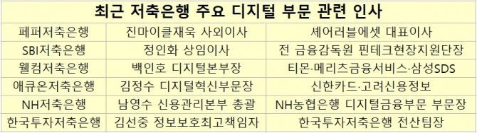 한 금융업계 관계자는 "저축은행은 업권 특성상 기존에도 순혈주의가 강한 편은 아니었지만 대체로 외부 초빙 인사는 시중은행이나 자산운용사, 증권사 출신을 선호하는 분위기가 강했다"며 "지난달부터 본격적으로 오픈뱅킹 시장이 열리자 앱을 고도화하고, 비대면 서비스를 강화하려면 디지털 금융 전문가를 빨리 모셔와야 한다는 위기감이 퍼진 것으로 보인다"고 평가했다.