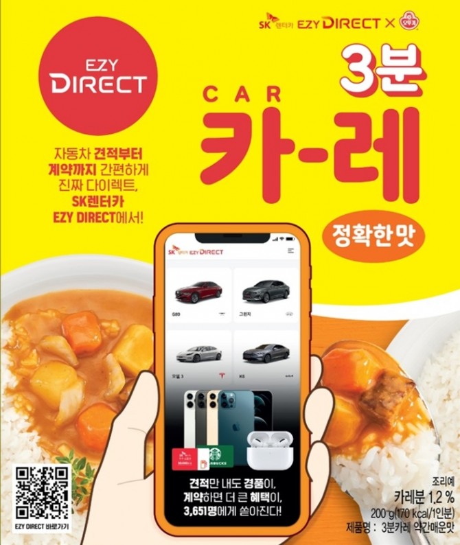 SK렌터카(대표 황일문)는 오뚜기와 협업을 통해 ‘이지다이렉트 3분 카(CAR)레(정확한 맛)’를 제작하고 11일부터 6월 30일까지 자사 페이스북과 인스타그램에 이벤트를 진행한다고 11일 밝혔다.