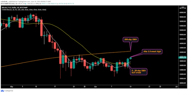 디지털 자산시장 메이커인 헤마이어(Hehmeyer)의 트레이딩 데스크 운영자 브라이언 테하코(Brian Tehako) 전무는 코인데스크와의 텔레그램 채팅에서 “주스를 다시 위쪽으로 가게 했다”라고 말하며 “5일 동안의 단순 이동 평균은 20일 평균에 도달했다. 시장은 4만1,900달러까지 상승할 수 있다”고 예측했다. 기술 분석 데이터 업체 트레이딩뷰(TradingView)에 따르면, 널리 추적되고 있는 200일 단순 이동 평균(SMA) 저항선은 현재 4만2,484달러에 형성되고 있다.