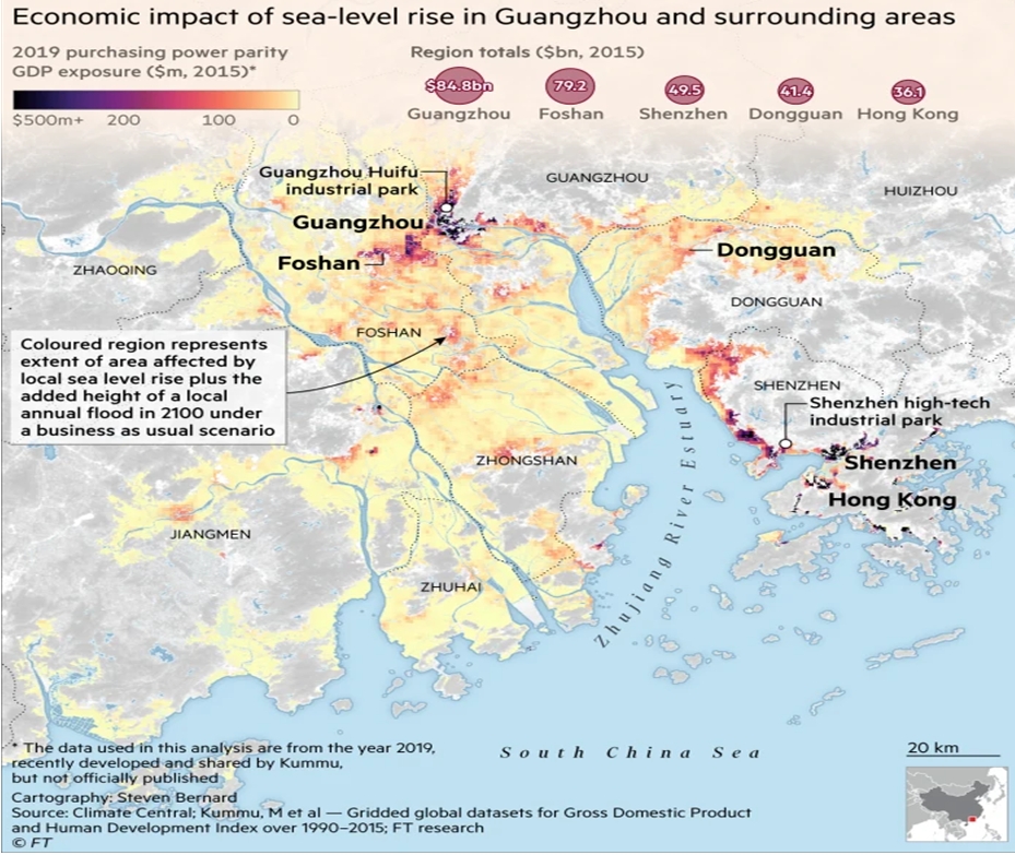미국 기반의 비영리 기후환경 단체인 ‘기후 센트럴’의 해수면 추정치와 핀란드의 연구원들의 데이터를 결합하여 2019년 1인당 구매력 GDP를 세분화하고 인구 밀도를 사용하여 조사한 결과에 따르면 온실 가스 배출에 대한 급격한 감축이 이루어지지 않는 한 중국의 가장 중요한 상업 허브 중 일부는 해수면 상승에 따른 파도와 홍수로 고통을 받을 수 있다.