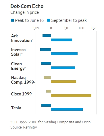 당시 닷컴버블을 주도했던 시스코 주가가 133%라는 상승률을 기록한 것이나 오늘날 테슬라 주가가 올해 최고점을 찍으면서 지난해 9월 대비 110%의 상승률을 기록한 것과 비슷한 양상이라는 것.