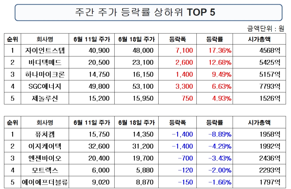 이외에도 바디텍메드, 하나마이크론, SGC에너지, 제놀루션 등이 주가상승률 상위권에 포진했다.