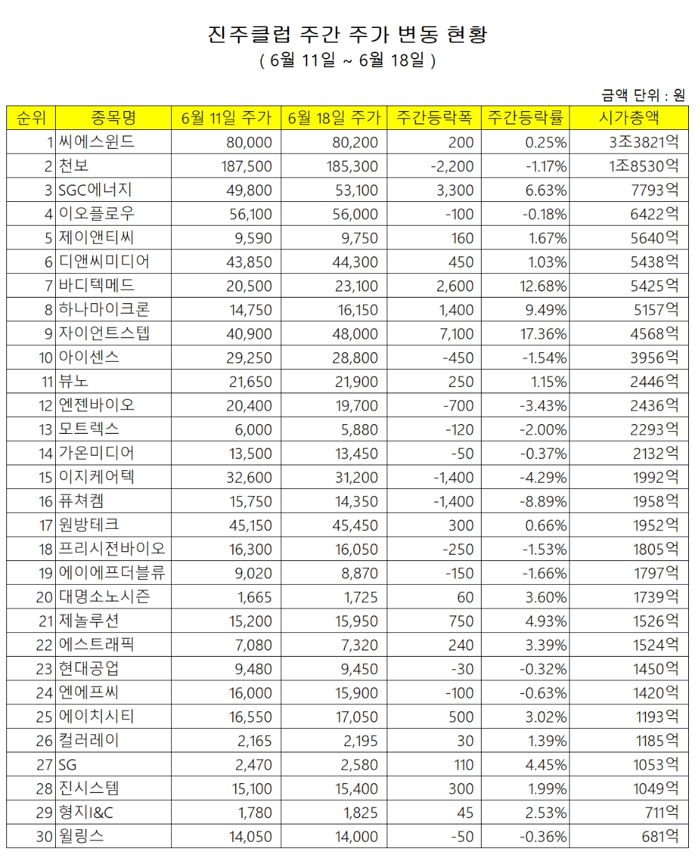 진주클럽 구성종목의 주간 주요 소식은 다음과 같다.