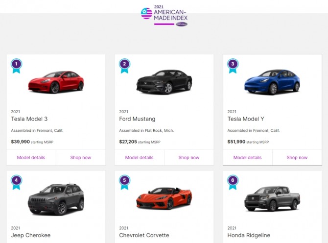테슬라 모델3은 자동차시장 조사업체 카스닷컴이 이날 발표한 ‘2021년 미국산 지수’에서 1위를 차지했다. 미국산 지수가 1위라는 것은 미국산 부품을 가장 많은 사용한 차라는 뜻이다. 전기차가 이 명단에서 으뜸을 차지하는 것은 처음이다.