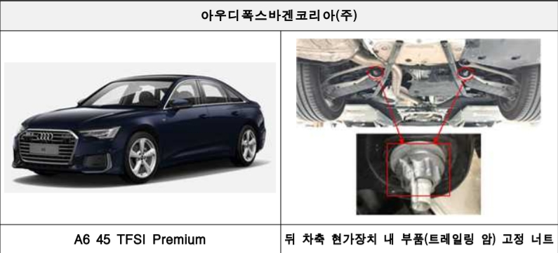 아우디폭스바겐코리아㈜에서 수입, 판매한 'A6 45 TFSI 프리미엄' 등 46개 차종 9759대(판매 이전 포함)와 포르쉐코리아의 '카이엔 쿠페' 등 2개 차종 424대(판매 이전 포함)는 뒤 차축 현가장치(차량의 차대 등 프레임에 바퀴를 고정하는 완충장치)의 부품에 문제가 발견됐다.