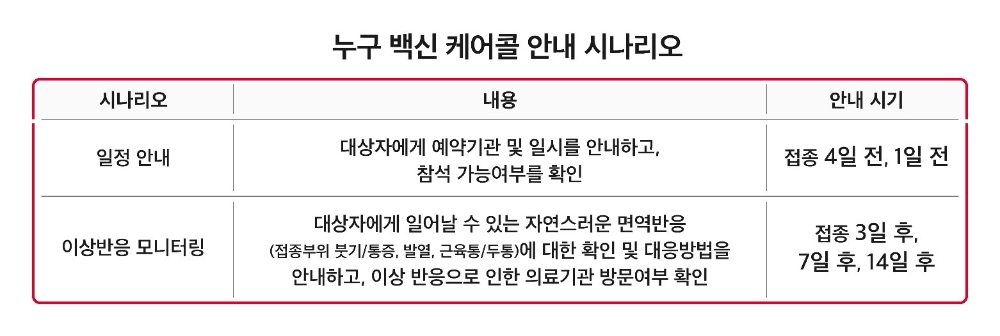 대상자가 전화를 받으면 AI가 "백신 접종 예약된 날짜가 O월 OO일 오전 O시이고 장소는 OO보건소인데요, 이 날 오실 수 있으시죠?", "혹시 지금 OOO님 주사 맞으신 곳에 통증 있으신가요?" 등의 백신 접종 사전∙사후의 안내를 진행한다.