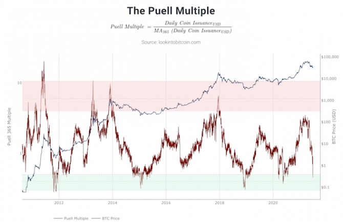 그래픽은 비트코인의 공급 측면 지표인 퓨엘 멀티플(Puell Multiple) 지수와 가격 변동 추이.