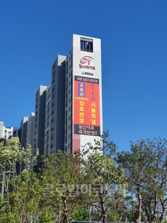 김포 고촌읍 '힐스테이트리버시티' 단지 외벽에 'GTX-D노선 서울 직결'을 주장하는 현수막이 걸려 있다. 사진=김하수 기자
