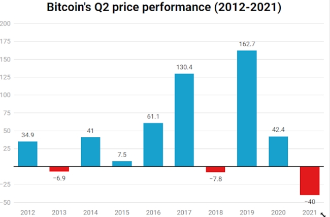 그래픽은 비트코인의 2012년 이후 2분기 가격변동률 추이.