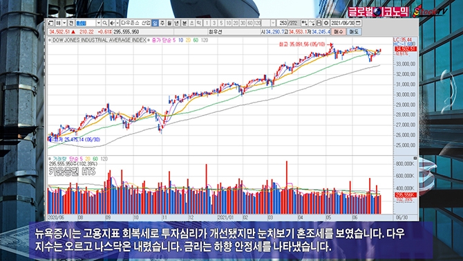 뉴욕증시는 고용지표 회복세로 투자심리가 개선됐지만 눈치보기 혼조세를 보였습니다. 다우 지수는 오르고 나스닥은 내렸습니다. 금리는 하향 안정세를 나타냈습니다.