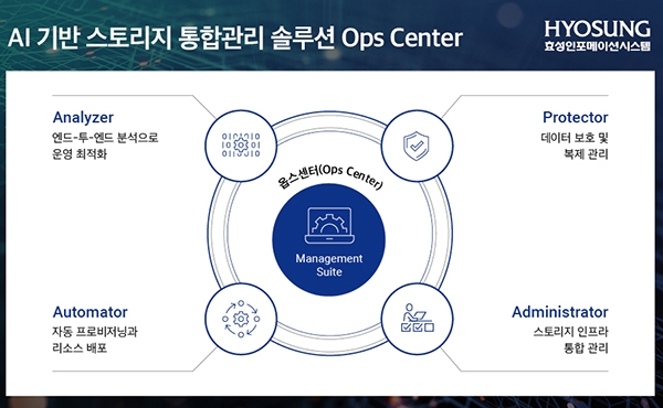 효성인포메이션시스템은 데이터 인프라의 관리, 최적화, 계획 및 보호가 가능한 통합 AIOps 기반의 '옵스 센터'를 통해 고객의 민첩한 IT 운영관리를 지원한다.