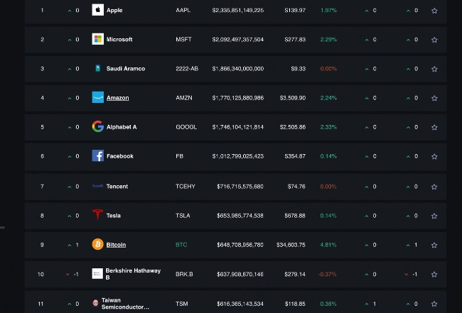 6,480억 달러의 시장 가치를 지닌 비트코인(BTC)은 여전히 JP모건 체이스, 엔비디아, 비자, 알리바바, 대만 반도체 제조업체(TSMC)와 같은 기업들보다 상위에 있는 세계 최고 자산이다. 비트코인의 시가총액은 도요타, 프록터앤갬블(P&G), 월트디즈니컴퍼니와 같은 회사의 두 배 이상이다. 또 비트코인의 평가액은 필립 모리스, 캐나다 왕립은행, 안호이저 부시, 씨티그룹과 같은 기업의 4배에 이른다.