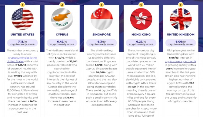 그 다음으로 가장 친가상화폐적인 국가는 키프로스, 싱가포르, 홍콩, 영국 등인 것으로 나타났다.