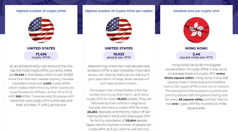 가상화폐 ATM 보급 현황. 세계 최다 보유국 미국, ATM 단말기당 사용인구 1위 미국, ATM 단말기 밀도 1위는 홍콩(왼쪽부터). 사진=크립토헤드
