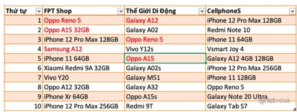 이에 따라 모바일월드와 FPT숍 두 소매 업체 목록에 이름을 올린 3개의 스마트폰 모델만 대표적인 베스트셀러로 집계됐다. 여기에는 오포 레노5, 오포 A15 및 삼성 A12가 포함됐다.