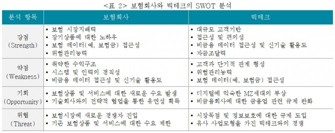 또 “정책당국은 새로운 유형의 리스크로 인한 시장실패를 방지하기 위해 금융규제 체계, 시장경쟁, 금융안정성, 소비자보호 등의 측면에서 다양한 검토를 수행할 필요가 있다”며 “빅테크가 보험서비스를 제공할 때 규제차익이 발생하는지 점검하고, 중·장기적으로 현행 권역별, 열거주의 중심의 금융규제를 기능별, 포괄주의 중심으로 전환하는 것에 대한 논의가 필요하다. 특정 플랫폼이 보험상품의 판매채널을 독점하지 않도록 시장환경을 조성하고, 경쟁심화로 인한 보험회사의 위험추구를 모니터링하며, 플랫폼을 통해 보험상품과 서비스를 이용하는 소비자에 대한 보호장치를 강화할 필요가 있다”고 강조했다.