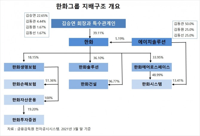 한화그룹의 지배구조는 상장회사인 한화가 지주회사의 역할을 맡고 있습니다. 비상장회사인 에이치솔루션도 유력한 계열사를 다수 갖고 있는 구조로 되어 있습니다. 한화는 올해 3월 말 현재 김승연 회장과 특수관계인이 지분 39.11%를 보유하고 있습니다.